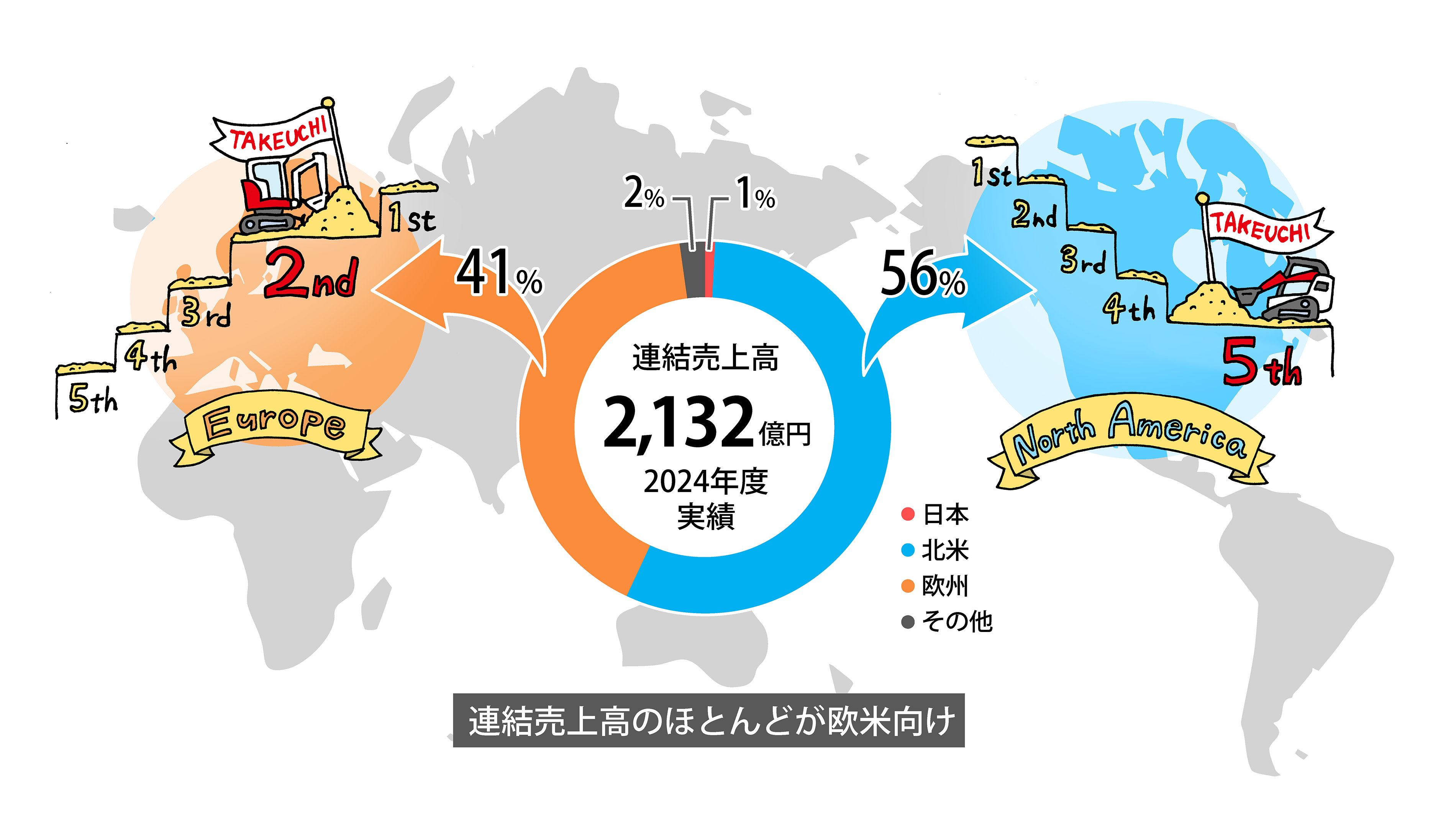 お客様のニーズをタイムリーに取り入れた新製品を市場投入し、主力市場の北米と欧州に経営資源を重点配置し、販売チャネルの拡充と質的向上に取り組んできた結果、欧州ではミニショベル、北米ではクローラーローダーの販売が大躍進しました。